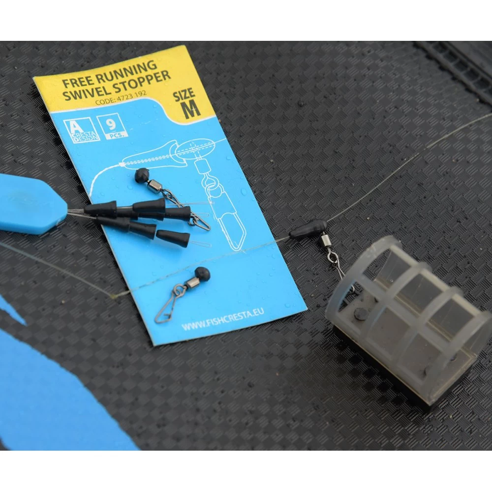 Cresta Free Running Swivel stoppers Medium, deze zijn de ideale oplossing voor het knopen van een schuivende Feeder montage. Dankzij de juiste hardheid en de extreem hoge grip op de lijn, kan deze stopper over een knoop geschoven worden, zodat deze geheel afgedekt wordt. Dit reduceert de kans op verwarringen enorm. De ronde vormgeving van de stopper valt precies om een Cresta Free Running Swivel heen, waardoor op natuurlijke wijze altijd een afhouder ontstaat. Door de lijn te twisten ontstaat de perfecte montage.