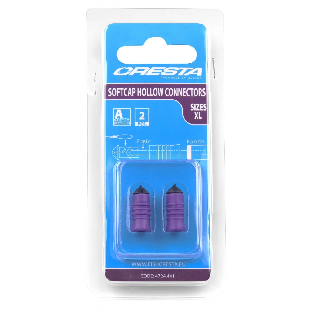 Cresta Soft Cap Hollow Connectors X Large Purple, deze vormen een compacte en betrouwbare verbinding tussen hoofdlijn en elastiek. Het harde insert gedeelte bezit aan de voorzijde een inkeping ter bevestiging van de hoofdlijn. De achterkant is voorzien van een ronde opening om het elastiek aan te monteren. De zachte cap is vormgegeven met voldoende ruimte voor de knoop en is voorzien van diverse ribbels voor grip. Door de cap over de inkeping tegen de kop van de insert te schuiven, wordt de connector eenvoudig gesloten. De rubberen cap reduceert het geluid bij het raken van de hengeltop en sluit dankzij de tapse vorm hier mooi op aan.