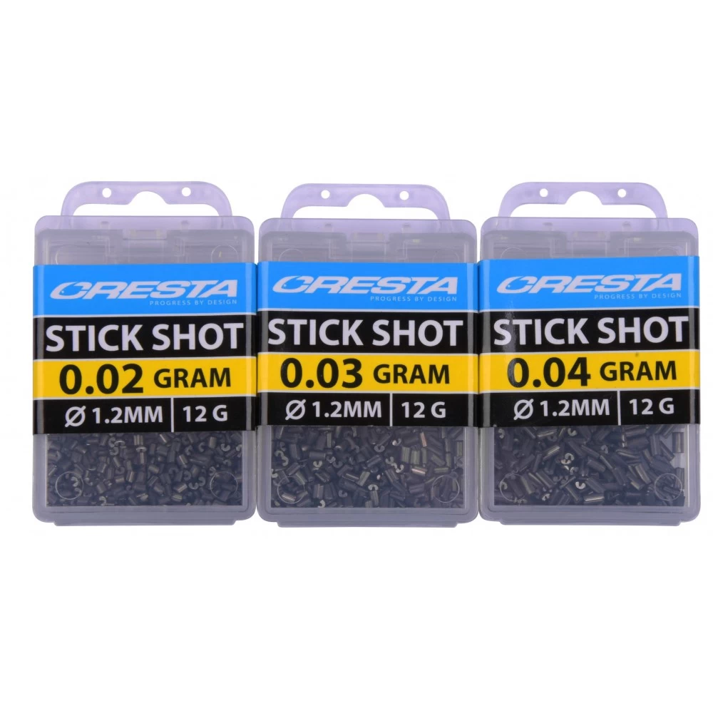 Cresta Stick Shots 1.2 mm – 0.04 gr, deze stick shots helpen je bij het eenvoudig uitloden van elk dobber. Dankzij de aanduiding in gewicht i.p.v. van nummers is het selecteren van het juiste loodje zeer eenvoudig. De juiste zachtheid en de perfect gecentreerde snede zorgen ervoor dat Stickshots gemakkelijk op zowel dunne als dikkere lijnen te fixeren zijn , zonder dat deze hierdoor beschadigen. De langwerpige vorm zorgt voor extra grip op de lijn, waardoor ze tijdens het vissen niet of nauwelijks verschuiven. De slanke vorm zorgt voor een geleidelijke en zeer natuurlijke manier van afzinken. Dit alles maakt Stickshots zeer geschikt voor de traditionele visserij op witvis en de karper visserij op commercials. Stickshots zijn verkrijgbaar in 16 verschillende maten van 0,02 t/m 1,0gr, zodat altijd een optimale loodzetting bereikt kan worden.