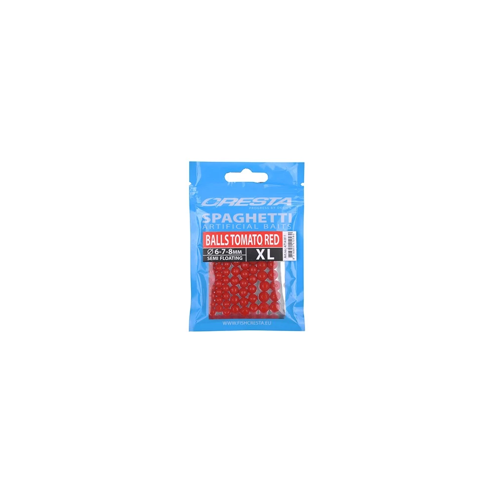 Cresta Spaghetti Balls Tomato Red XL, zijn een drijvend kunstaas van hoge kwaliteit. Wanneer deze op de haak geplaatst wordt, ontstaat een zwevende of zeer langzaam zinkende aaspresentatie. Samen met de opvallende kleuren wordt deze hier door enorm attractief voor vele vissoorten. Spaghetti XL Balls kunnen direct op de haak gebruikt worden in één of meerdere kleuren tegelijk. Maar geeft ook in combinatie met levend aas, zoals maden en wormen, extra vangkracht. De speciale XL Balls uitvoering is ideaal voor een zomerse visserij op grote vis wanneer een groter formaat haak moeten worden uitgebalanceerd. Dankzij de 3 verschillende formaten in de verpakking kunnen de Spaghetti Balls gecombineerd worden met vele haaksoorten en maten.