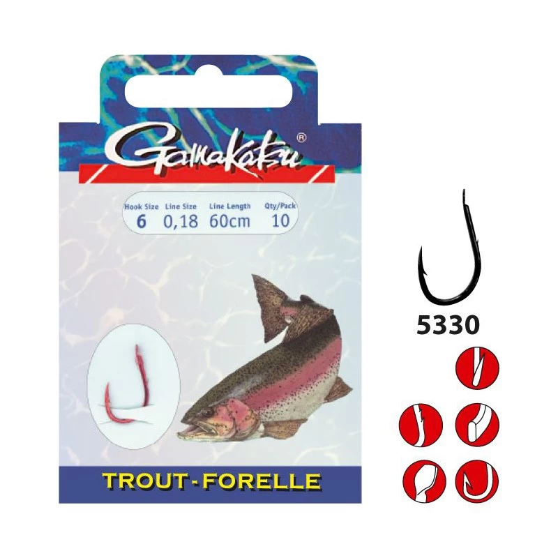 Gamakatsu Onderlijn Trout LS-5330 0.16 mm – 60 cm – Size 10, deze onderlijntjes zijn kant en klare onderlijnen speciaal ontworpen voor het vissen op forel. Door de sterke draad en een lijntje van 60 centimeter met een vlijmscherpe punt wordt de haak probleemloos gezet bij de forel. Deze haken zijn bijzonder sterk en zullen goed blijven hangen in de zachte bek van de forel. De haken zijn stuk voor stuk geknoopt aan het zeer sterke G-LINE. De onderlijnen zitten netjes verpakt in plastic mapjes en zijn door middel van lus in lus verbinding gemakkelijk op de hoofdlijn te monteren. Een onderlijnen boekje zijn voorzien van 10 onderlijnen.