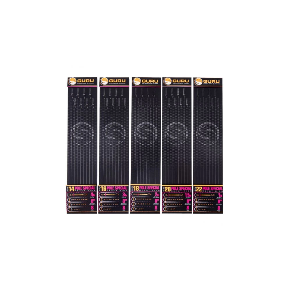 Guru Pole Special Rigs 8” Size 18, zijn speciaal ontworpen voor het vissen met de vaste stok en zijn perfect voor het gebruik van aassoorten als maden, casters, pieren zelfs vers de vase. Deze onderlijnen zijn voorzien van Pole Special haken met weerhaak en zijn geknoopt van Guru N-Gauge lijn. Alle onderlijnen zijn qua lijndikte op de haakmaat afgestemd.Â