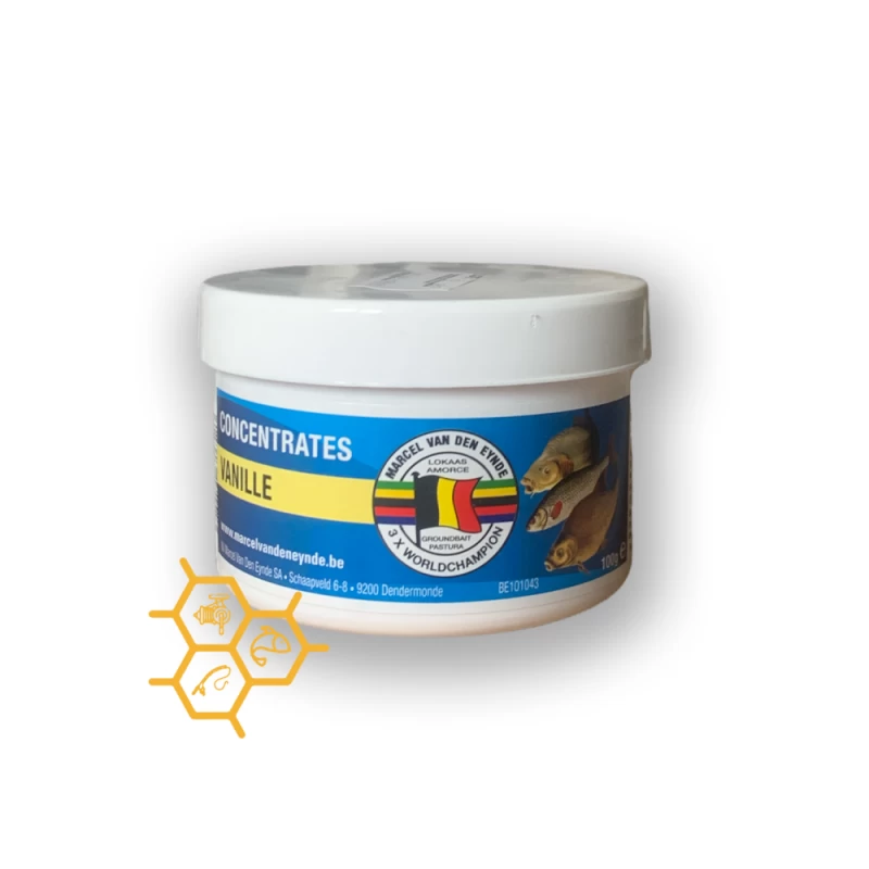 Marcel Van Den Eynde Concentraat Vanille, een concentraat kan je gebruiken voor de witvis als voor karper. Concentraten zijn toevoegingsmiddelen of additieven die kunnen worden gebruikt om het voeder extra smakelijk te maken naar gevoel. Wij adviseren een gewicht van 10 gram te gebruiken per kg droog lokaas. Het toevoegen van concentraten doe je best met lauw, warm water. De warmte laat aroma’s veel beter tot uiting komen en bijgevolg worden deze sterker waargenomen door de vis. Om even algemeen toe te lichten wat de producten zijn definiëren we het beste van al de benaming “concentraten ” = iets zeer sterk ruikend en of smakend zeer geconcentreerd.