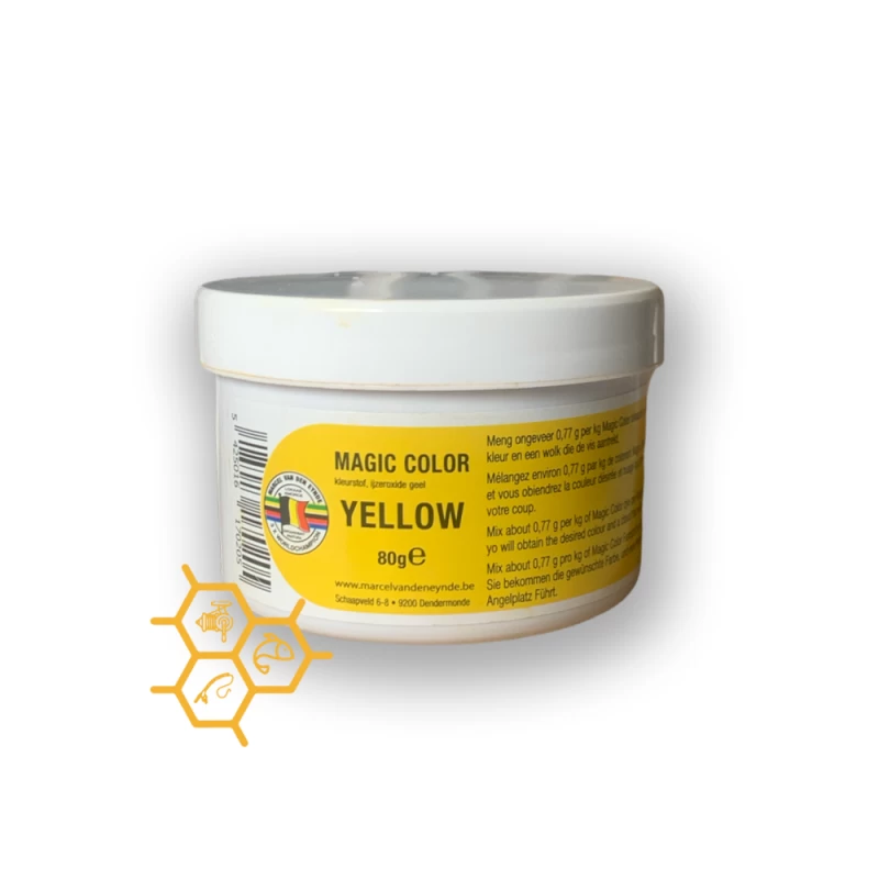 Marcel Van Den Eynde Magic Colour Geel, Magic colour zijn geconcentreerde kleurstoffen waar mee men het lokaas perfect kan aanpassen aan de precieze visomstandigheden. Bovendien vormen zij de ideale wolkvormer. Perfect bij het vissen op alvers en andere kleine vissen. Ook ideaal voor het vissen “op half water”.