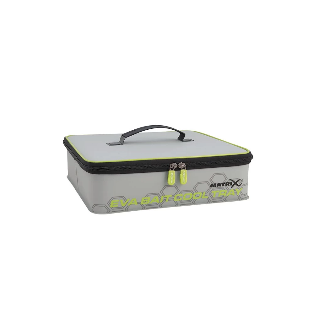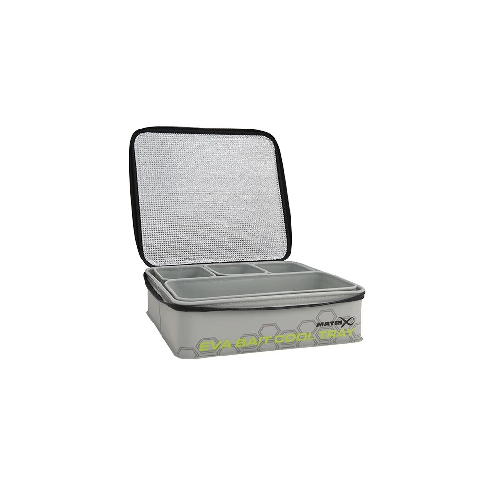 Matrix EVA Bait Cool Tray Light Grey, is ideaal voor het bewaren en beschermen van aas tegen de warmte, Geleverd met 4 interne EVA bait containers (3x 2pt, 1x 7pt), Lichtgrijze kleur reflecteert zonlicht, Gevoerd met folie om aas koel te houden, Hitte-gesealde waterdichte naden, Gemaakt van duurzaam EVA materiaal, Gemakkelijk te reinigen.