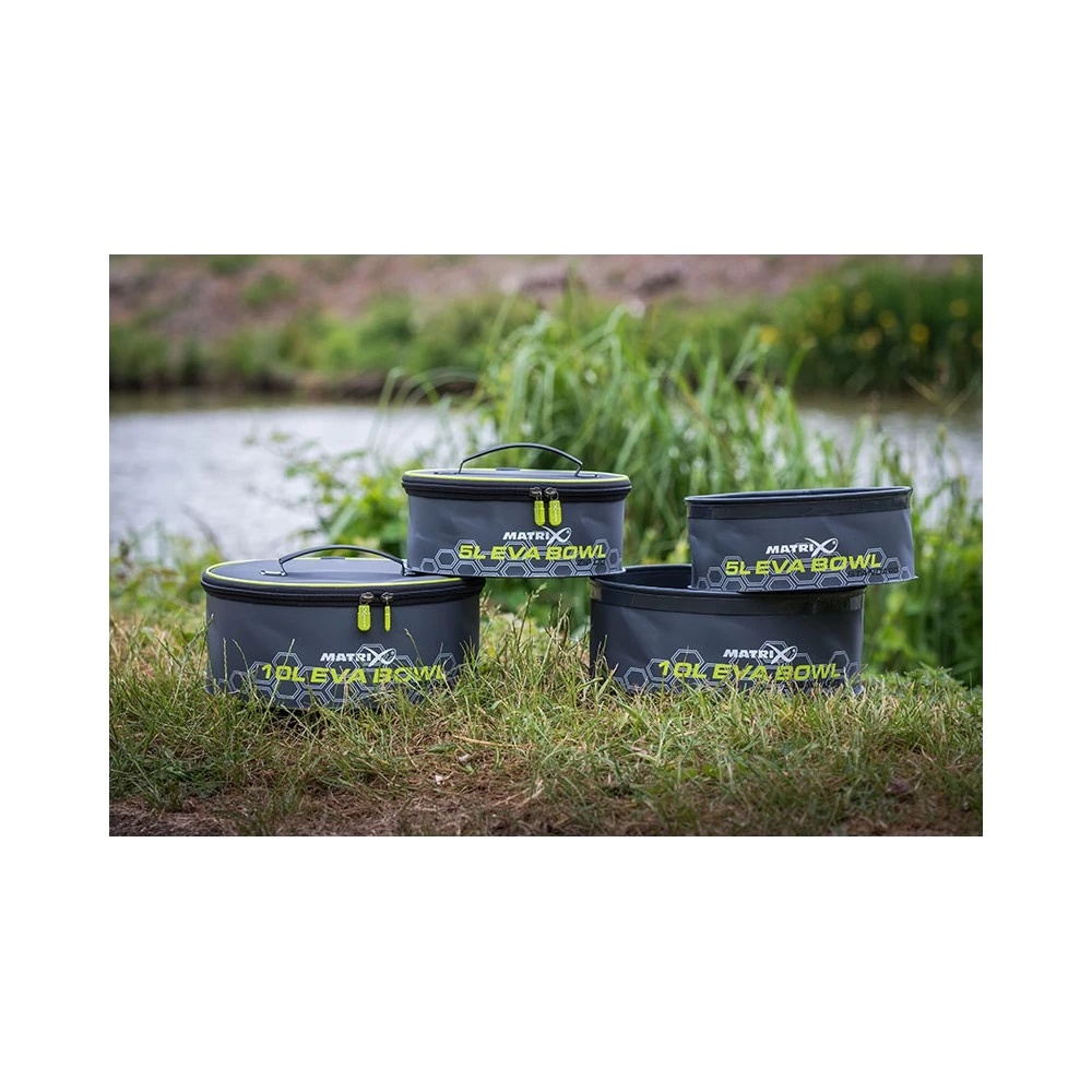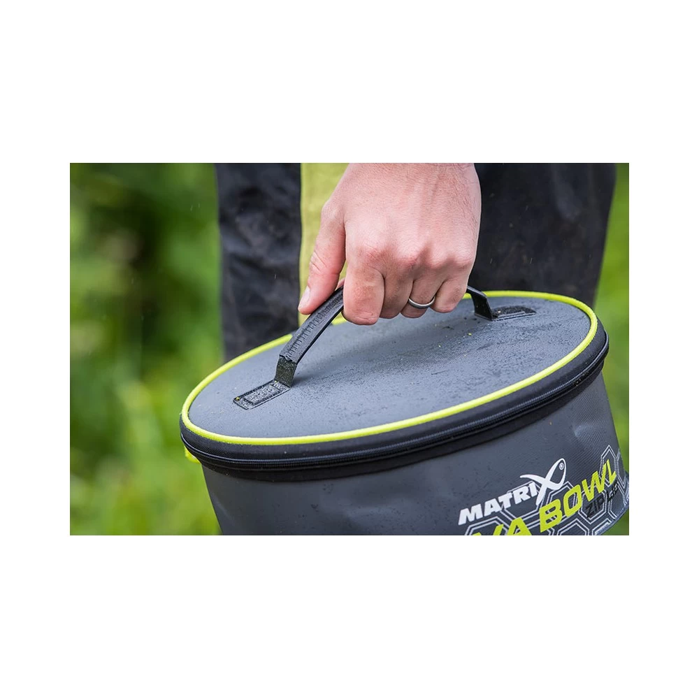 Matrix EVA Bowl With Zip Lid 5 Liter, ideaal voor het mengen en bewaren van aas, Gemaakt van duurzaam EVA materiaal, Dikkere EVA zijkanten voor stevigheid, Hitte-gesealde waterdichte naden, Grote robuuste Matrix rits pullers, Extra grote ritsen voor extra sterkte, Gemakkelijk te reinigen, Gegoten handgreep. Verkrijgbaar in 5 en 10 Liter.