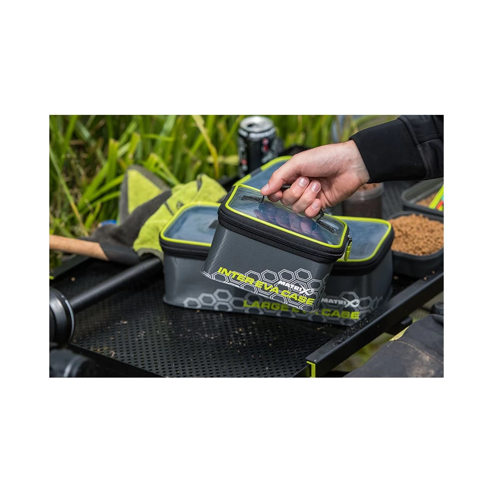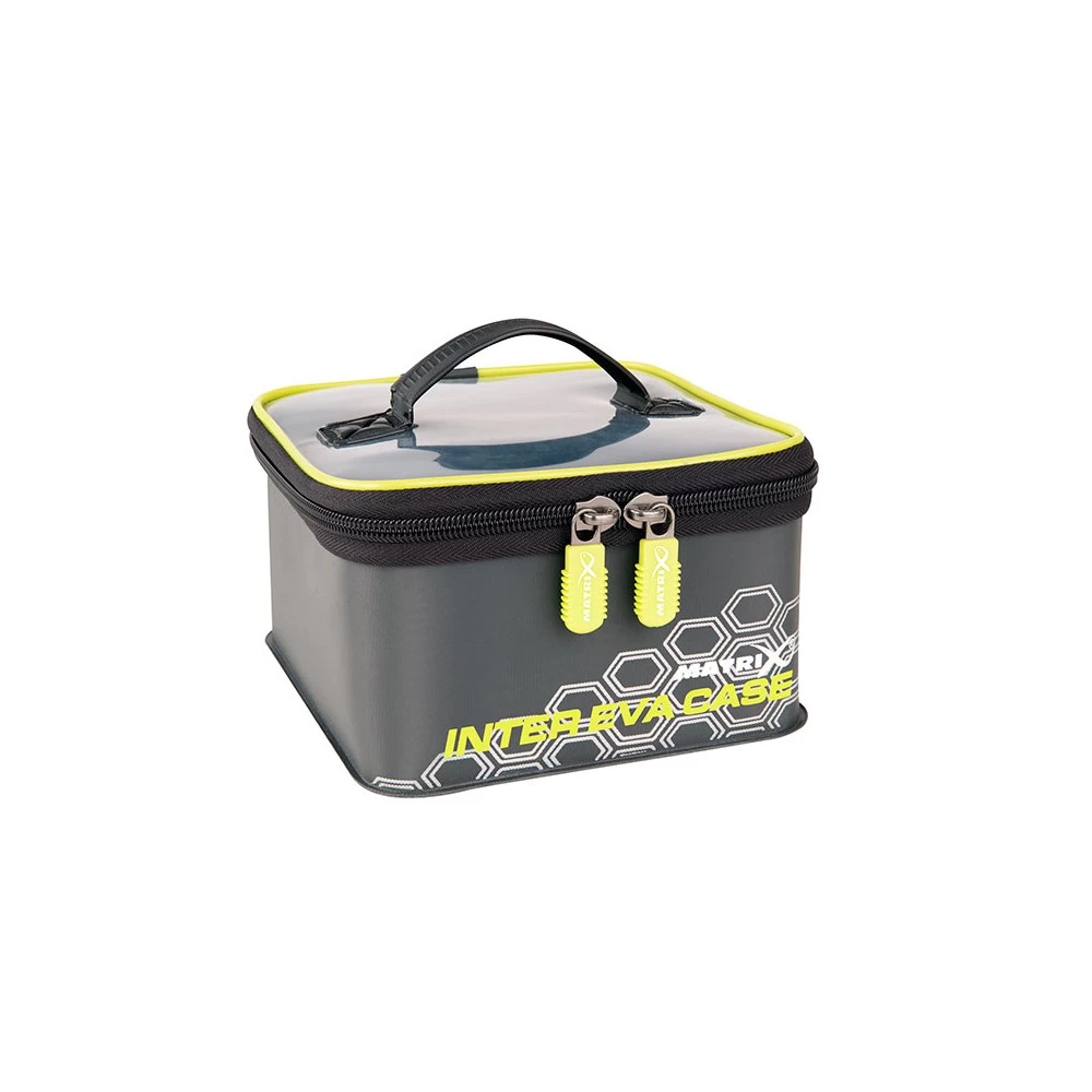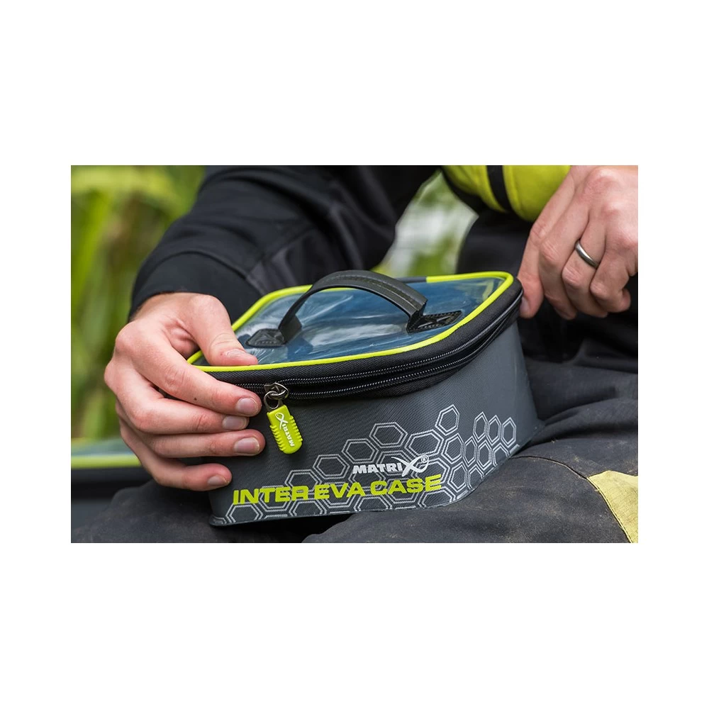 Matrix EVA Inter Case, heel gemakkelijk voor het opbergen van je klein materiaal en aas, Gemaakt van duurzaam EVA materiaal, Hitte-gesealde waterdichte naden, Transparante PVC bovenkant voor zichtbaarheid inhoud, Grote robuuste Matrix rits pullers, Extra grote ritsen voor extra sterkte, Gemakkelijk te reinigen, Gegoten handgreep. Verkrijgbaar in Mini – Inter en Large.