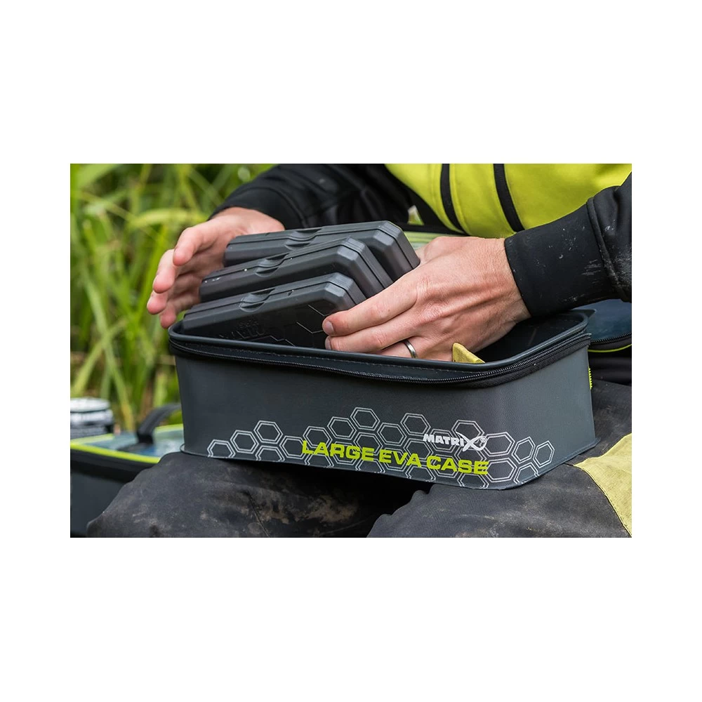 Matrix EVA Large Case, heel gemakkelijk voor het opbergen van je groot materiaal en aas, Gemaakt van duurzaam EVA materiaal, Hitte-gesealde waterdichte naden, Transparante PVC bovenkant voor zichtbaarheid inhoud, Grote robuuste Matrix rits pullers, Extra grote ritsen voor extra sterkte, Gemakkelijk te reinigen, Gegoten handgreep. Verkrijgbaar in Mini – Inter en Large.