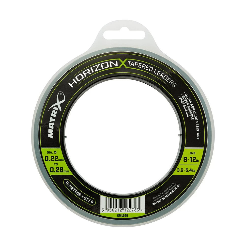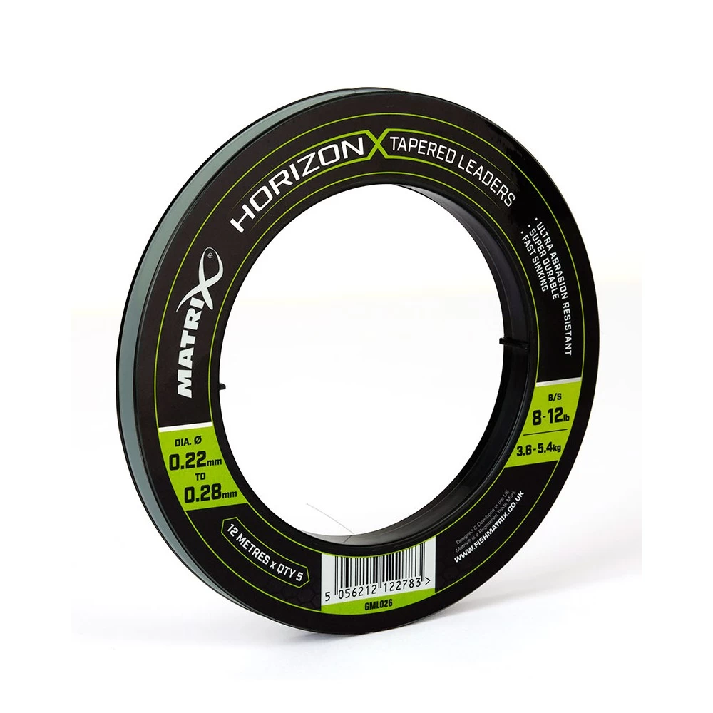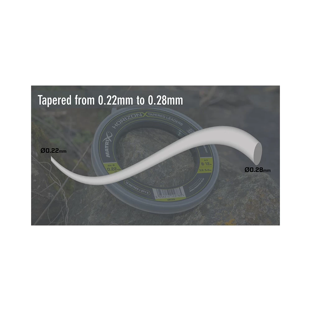 Matrix Horizon X Tapered Shock Leader 0.22 to 0.28 mm, deze shock leader reduceert wrijving en verhoogt de werpafstanden. Getaperd van 0,22mm naar 0,28mm. Extreem schuurbestendig, Superhoge trekkracht op de knoop, Onopvallende kleur, Extreem duurzaam en soepel. Geleverd in lengtes van 12 meter, 5 stuks per spoel.