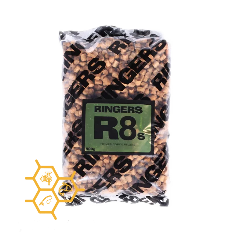 Ringers Premium Coarse Pellets R8s 8 mm, zijn gemaakt van vismelen van hoge kwaliteit, en moeten zeker voor geweekt worden voor het beste resultaat. In Engeland heeft geen enkele aas soort zo een grote impact gehad als deze pellets. De pellets zijn er in Engeland verantwoordelijk voor dat er door de competitievissers amper nog met wormen en casters gevist wordt. Het weken van de pellets gedurende korte tijd heeft als gevolg dat de pellets sponzig worden. Je kan de pellets puur voeren in een voer korf, cuppen met de vaste stok, of simpelweg toevoegen aan het grondvoer dat je gebruikt om de vis aan het azen te houden gedurende een aantal uren.
