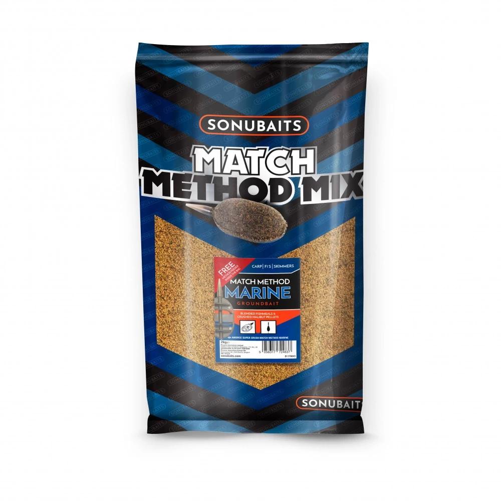 Sonubaits Match Method Mix Marine, is de nieuwste toevoeging aan ons Match Method Mix Assortiment, de Match Method Marine is gebaseerd op ons best verkochte grondvoer met de toevoeging van gemalen pellets, heilbot en vismeel van de aller hoogste kwaliteit. Wanneer deze Match Method Mix Marine goed gemengd is, valt de Match Method Mix Marine kleur tussen de ‘Original’ en de ‘Dark’ soorten. En dit terwijl de algehele eigenschappen vergelijkbaar blijven met de extra visachtige aantrekkingskracht van Marine Halibut, waardoor het een perfecte allround mix is, ideaal voor gebruik met een dobber of de feeder . Deze Match Method Mix is eenvoudig te mixen, perfect voor F1’s, karpers en skimmers, kan ook zeker gebruikt worden met een Method Feeder in elke zak zit een GRATIS Preston Inline Mathod Feeder. Verpakt in een hersluitbare 2 kilo zak.