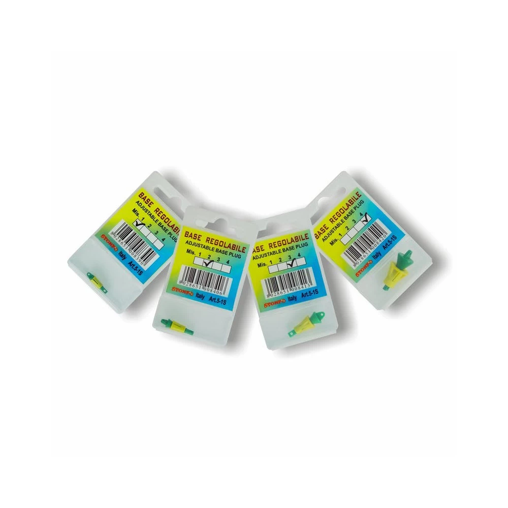 Stonfo Adjustable Base Plug Size 3, dit zijn verstelbare basispluggen voor elastiek montage, geproduceerd in 4 verschillende uitvoeringen. Door aan de basis te draaien kan men deze pluggen vergroten of verkleinen om de desgewenste elastiekspanning te verkrijgen.